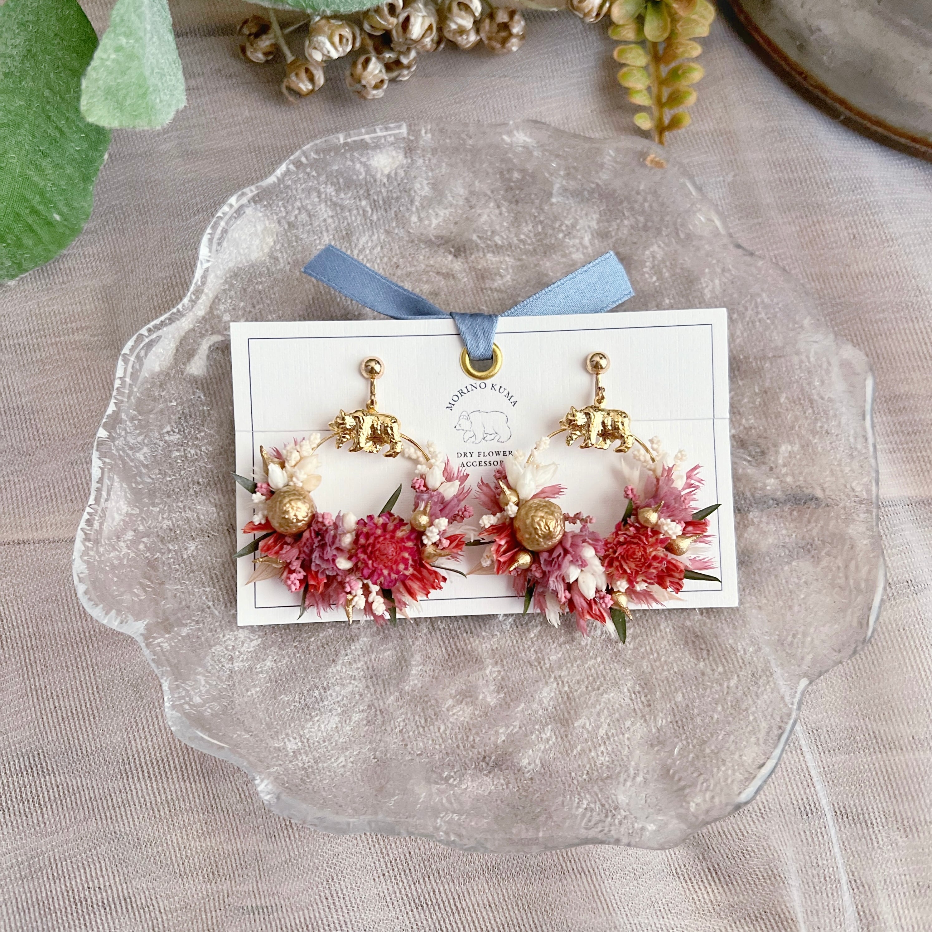 まるで甘いストロベリーアイスのように、真っ赤なドライフラワーをぎゅっと集めた冬のイヤーアクセサリー。
